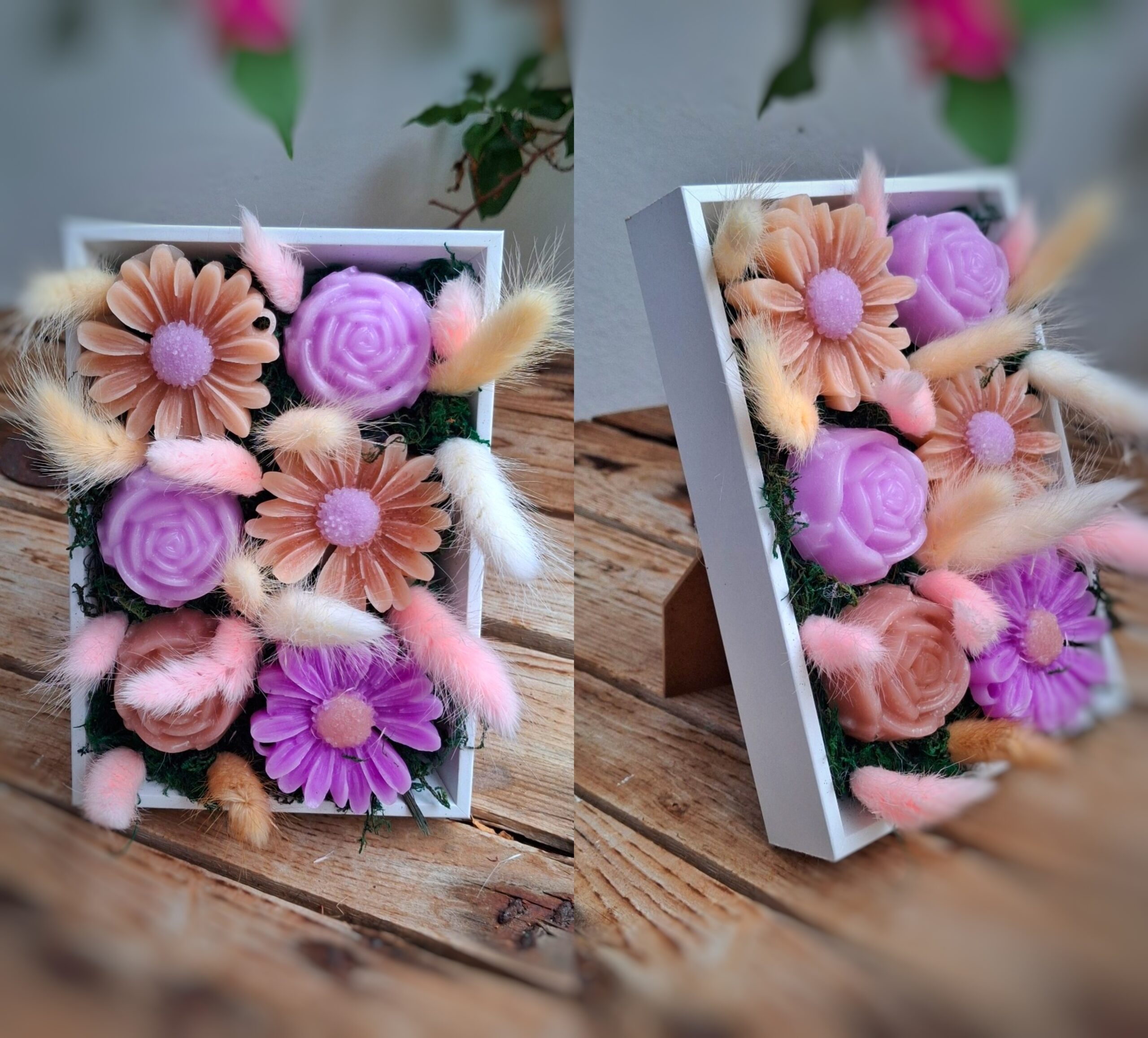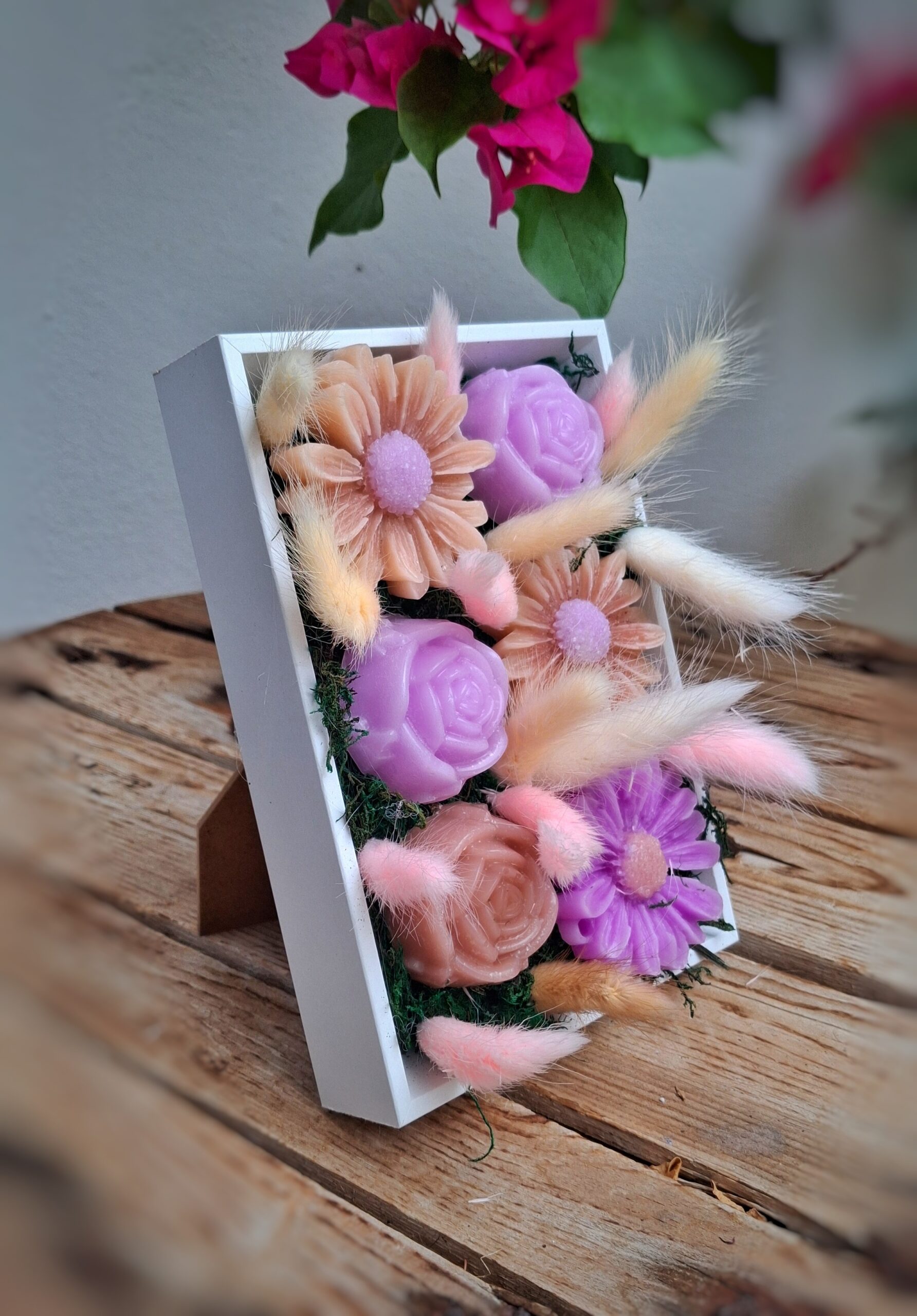 Χειροποίητη σύνθεση με κερινα λουλουδια σε κουτι ( 025 )
