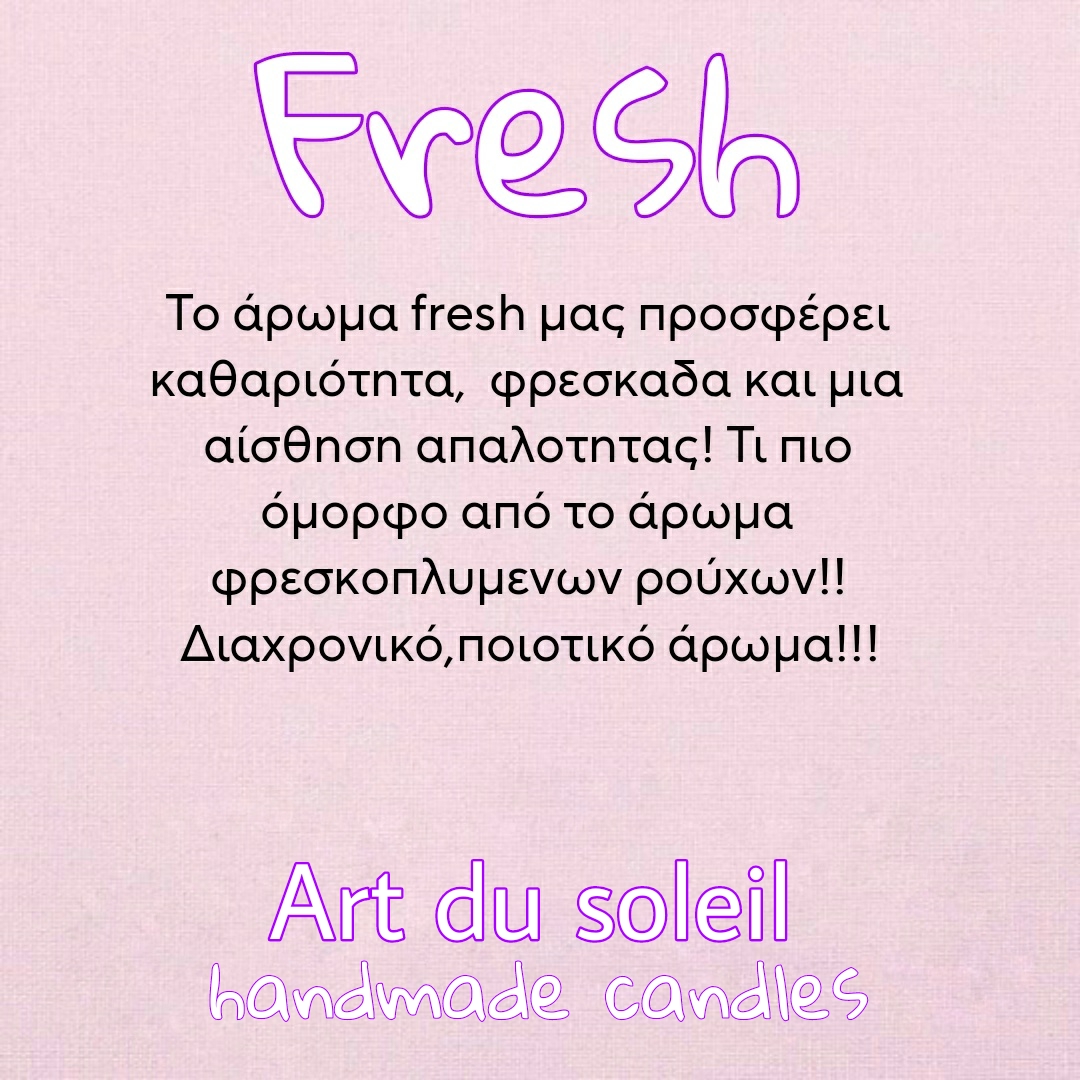 ΤΟ ΑΡΩΜΑ FRESH ΜΑΣ ΠΡΟΣΦΕΡΕΙ ΚΑΘΑΡΙΟΤΗΤΑ, ΦΡΕΣΚΑΔΑ ΚΑΙ ΜΙΑ ΑΙΣΘΗΣΗ ΑΠΑΛΟΤΗΤΑΣ! ΤΙ ΠΙΟ ΟΜΟΡΦΟ ΑΠΟ ΤΟ ΑΡΩΜΑ ΦΡΕΣΚΟΠΛΥΜΕΝΩΝ ΡΟΥΧΩΝ! ΔΙΑΧΡΟΝΙΚΟ, ΠΟΙΟΤΙΚΟ ΑΡΩΜΑ!